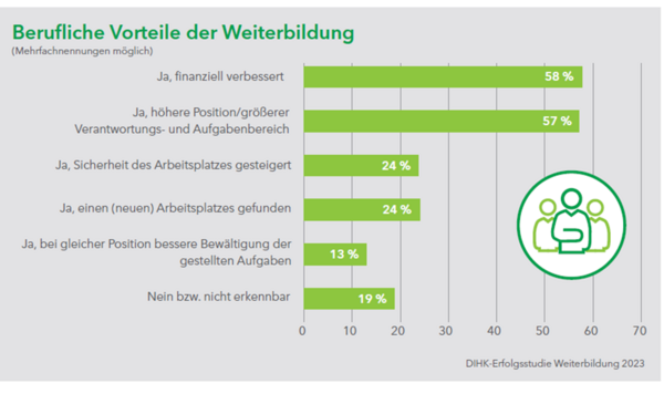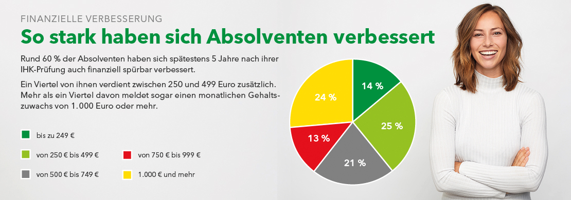 Um das herauszufinden, hat die DIHK knapp 20 000 ihrer Absolvent:innen einer höheren Berufsbildung befragt. Und die Ergebnisse der Studie überzeugen: 81 Prozent der Befragten berichten, dass sich die Weiterbildung positiv auf ihre berufliche Entwicklung ausgewirkt hat. 75 Prozent haben eine höhere Position beziehungsweise einen größeren Verantwortungs- und Aufgabenbereich erreicht, 58 Prozent können sich über eine finanzielle Verbesserung freuen.