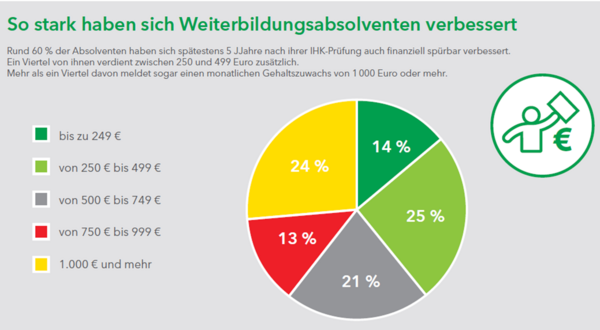 Ein Grund, warum viele Absolvent:innen sich für eine Aufstiegsfortbildung entscheiden, ist neben den neuen Aufgaben die Chance auf ein höheres Gehalt. Hat sich die Weiterbildung nun im wahrsten Sinne des Wortes ausgezahlt? Auch hier gibt die Studie Aufschluss: Von denjenigen Befragten, die sich durch die Weiterbildung beruflich finanziell verbessern konnten, verdienen 60 Prozent mindestens 500 Euro brutto mehr; bei über einem Viertel sind es sogar über 1.000 Euro brutto.