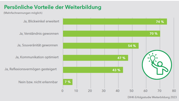 Neben den beruflichen wurde auch nach den persönlichen Vorteilen der Weiterbildung gefragt. Hier gaben sogar 93 Prozent an, dass die Weiterbildung vorteilhafte Auswirkungen auf die persönliche Entwicklung hatte. Für 74 Prozent hat sich der Blickwinkel erweitert, 70 Prozent haben Verständnis gewonnen und 54 Prozent mehr Souveränität. Über eine optimierte Kommunikation freuen sich 47 Prozent.